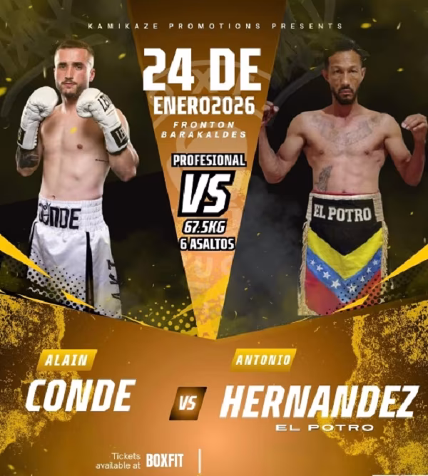 El vasco Alain Conde (3-0, 2 KO), al que conocimos mejor en ESPABOX, encabeza un evento organizado por Kamikaze Promotions el 24 de enero en el Frontón de Baracaldo (Vizcaya). El prometedor púgil de 25 años quiere mantener su condición de invicto en su cuarto combate profesional. En este primer duelo de 2026 se enfrentará al experimentado venezolano Rafael Hernández (37-33-4, 27 KO) a seis asaltos en el peso wélter. Conde busca empezar este año de la mejor manera posible tras conseguir en 2025 dos victorias, en marzo contra el argentino residente en Alicante Brian Ávila (2-15, 2 KO), por KOT en el primer asalto, y en junio ante el venezolano afincado en Valencia Anderson Rangel (6-45-2, 4 KO), por decisión unánime.