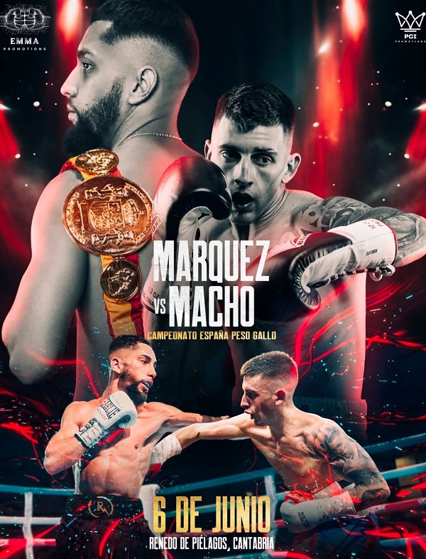 El sevillano Alberto ‘Rayito’ Márquez (9-2-1, 1 KO) hará la primera defensa del título nacional del peso gallo contra el cántabro Bruno Macho (10-0-1, 3 KO) el 6 de junio en Renedo de Piélagos (Santander). El púgil andaluz se proclamó campeón de España el pasado 31 de enero tras derrotar, aunque no exento de polémica, al madrileño Alberto Motos ‘Mopla’ (6-2, 0 KO) por decisión dividida. El evento, cuyo combate estelar será esta disputa, está organizado por Emma Promotions y PCI Promotions, que confirmarán más detalles de la velada próximamente. El campeón nacional del peso gallo nos confirmó en una entrevista que su interés era defender el título lo antes posible sin importarle el rival, que finalmente será Bruno Macho, despejando las dudas sobre una posible revancha con Alberto Motos, que no se dará por ahora.