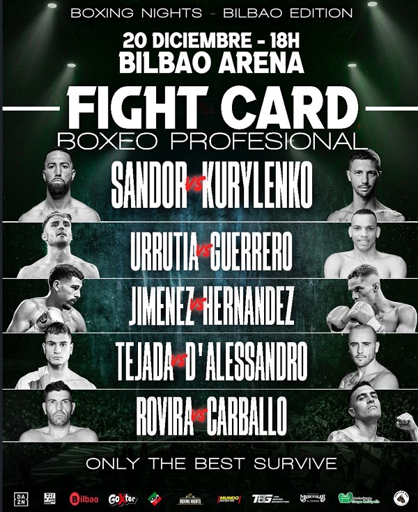 El tricampeón de Europa del peso superligero y aspirante al título mundial, el barcelonés Sandor Martín (42-4, 15 KO), volverá a boxear en España después de tres años de pleitos internacionales. Este sábado 20 de diciembre se enfrentará al campeón nacional ucraniano Yanis Kurylenko (14-1, 8 KO) en un duelo a ocho asaltos en el Bilbao Arena. El barcelonés llega con la ilusión de poder conseguir una oportunidad mundialista, tras perder por decisión dividida en marzo contra Alberto Puello (24-1, 10 KO) por el WBC superligero. Su rival buscará su segunda victoria del año tras defender su título nacional de la misma categoría en junio.