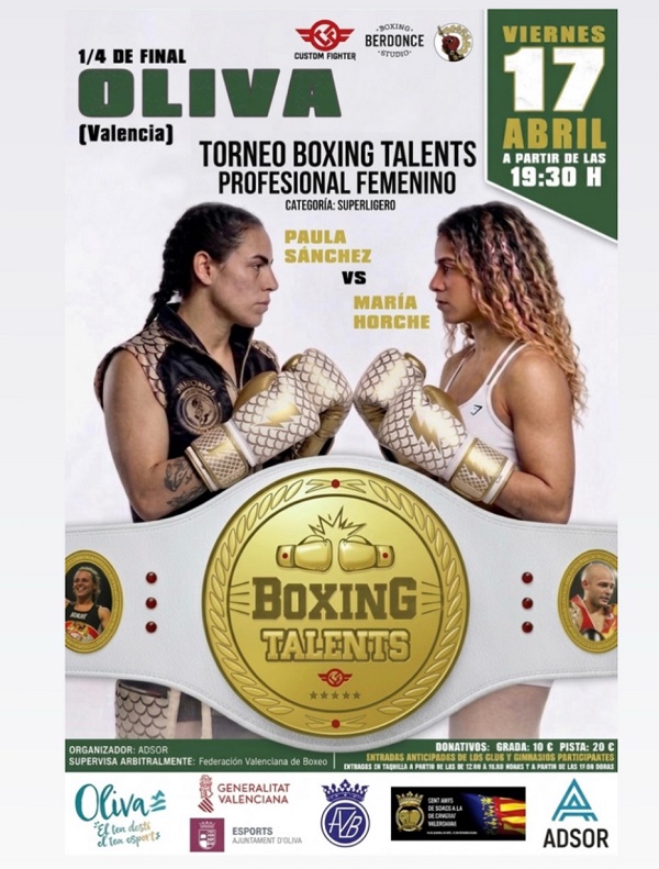 El próximo 17 de abril / Oliva (Comunidad Valenciana) se prepara para la inauguración del torneo profesional con el combate entre las guerreras: María Horche vs. Paula Sánchez. Antes del combate profesional, Oliva Boxing Talents ofrecerá la disputa de tres semifinales del torneo en la categoría amateur élite masculino, (boxeadores amateur experimentados; que están a punto de dar el salto al campo profesional. De esta selección se encarga toda una institución del pugilismo español como es Manel Berdonce, cuya trayectoria como boxeador olímpico, entrenador y formador garantiza un criterio riguroso, profesional y objetivo, conocido como el Tigre de Tetuán. Conoceremos a los primeros finalistas de las categorías 60-65 Kg y 70-75 Kg y seis combates correspondientes a los 1/4 de Final.