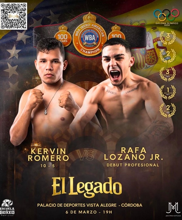 El subcampeón mundial amateur en la categoría de -55 kg., Rafael Lozano Jr., ha confirmado las condiciones de su debut como profesional, peleará el 6 de marzo en el Palacio Vistalegre de Córdoba por un título intermedio WBA, el Iberoamericano del peso mosca. El cordobés ha hecho público su rival, que será el venezolano Kervin Romero (10-5, 7 KO) en un duelo pactado a diez asaltos. El andaluz de 21 años, hijo del doble medallista olímpico y actual seleccionador nacional Rafael Lozano, ha decidido dar un paso más en su carrera, comenzando con la gran exigencia de los diez asaltos para disputar cuanto antes el título nacional de la misma categoría, que actualmente se encuentra vacante, como podemos observar en el Ranking Profesional Español ESPABOX.