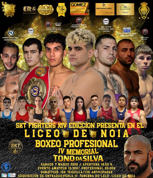 SKT Fighter y la nueva promotora Terra de Loitadores organiza el IV Memorial Tono da Silva en una gran velada de boxeo que tendrá lugar en Noia (A Coruña) el 7 marzo, con apertura de puertas a las 18:00. El evento contará con dos combates profesionales a seis asaltos de tres minutos. En uno de ellos, el púgil local Silvestre Gómez (3–0, 1 KO) se enfrentará al panameño Omir Rodríguez (15-31-1, 6 KO) pactado en -78 kg. Será la cuarta pelea profesional de Silvestre, que buscará seguir creciendo ante su público y contra un experimentado rival.